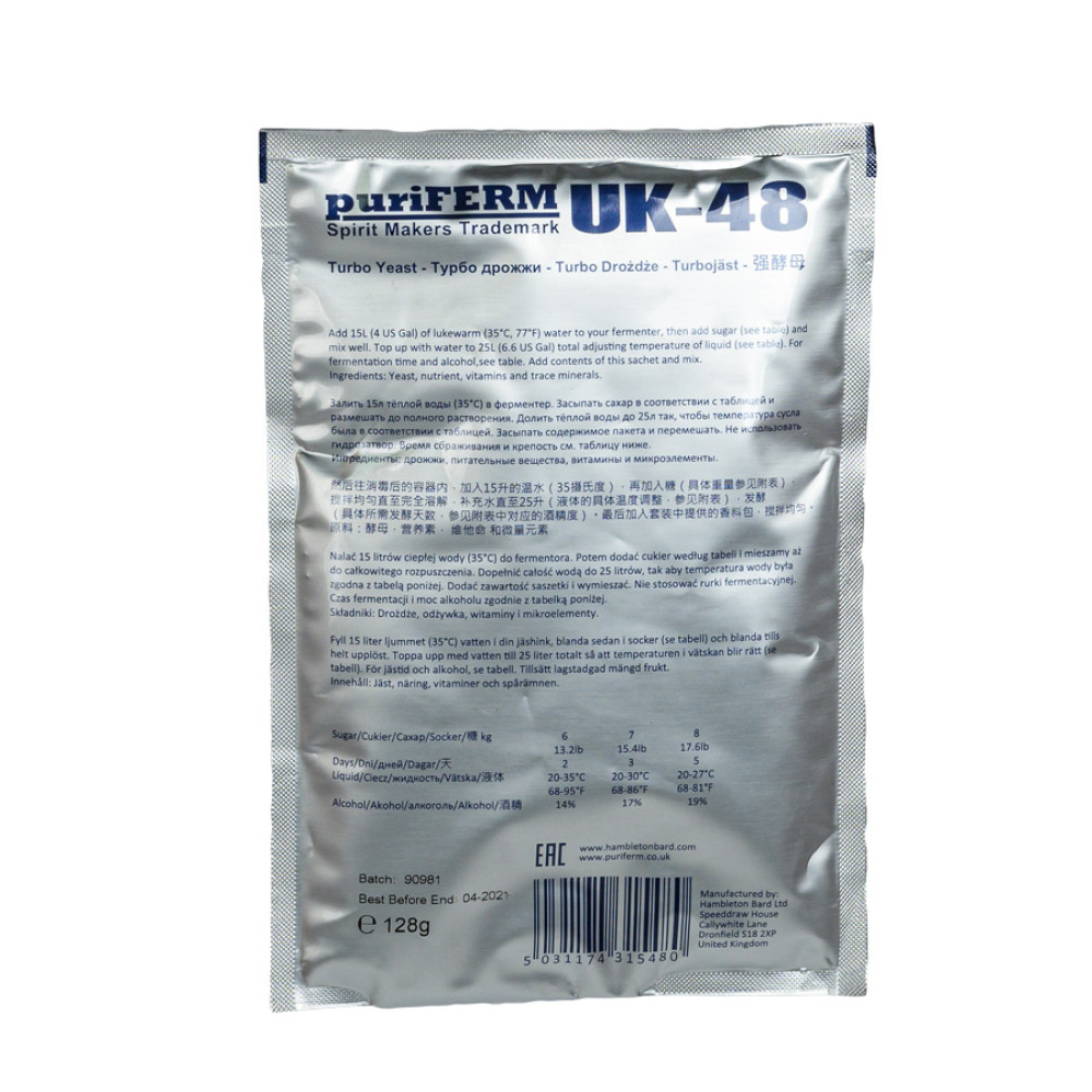 Active dry alcoholic turbo-yeast Puriferm UK-48 TURBO alcoholic yeast (128 gr) with a full range of macro and micro nutrient elements, ideal for fermenting fruit and sugar bases of any raw material (glucose sugar syrup). Turbo Yeast Turbo Yeast Alcohol Puriferm UK-48 TURBO (128 g) is especially suitable for fast and high alcohol fermentation.